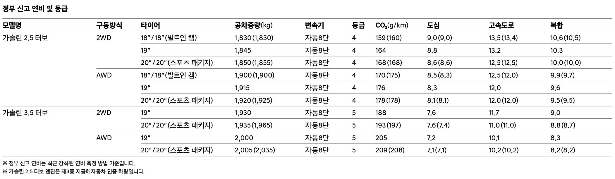 가솔린 2.5 터보 기본 모델의 최고 출력은 304마력, 가솔린 3.5 터보 모델은 380마력의 엔진 성능을 보여줍니다. 주행 성능으로는 기본 후륜구동이나 4륜 구동(AWD)로 선택 가능하며 복합 연비는 9.9 ~ 10.6km/l 입니다.