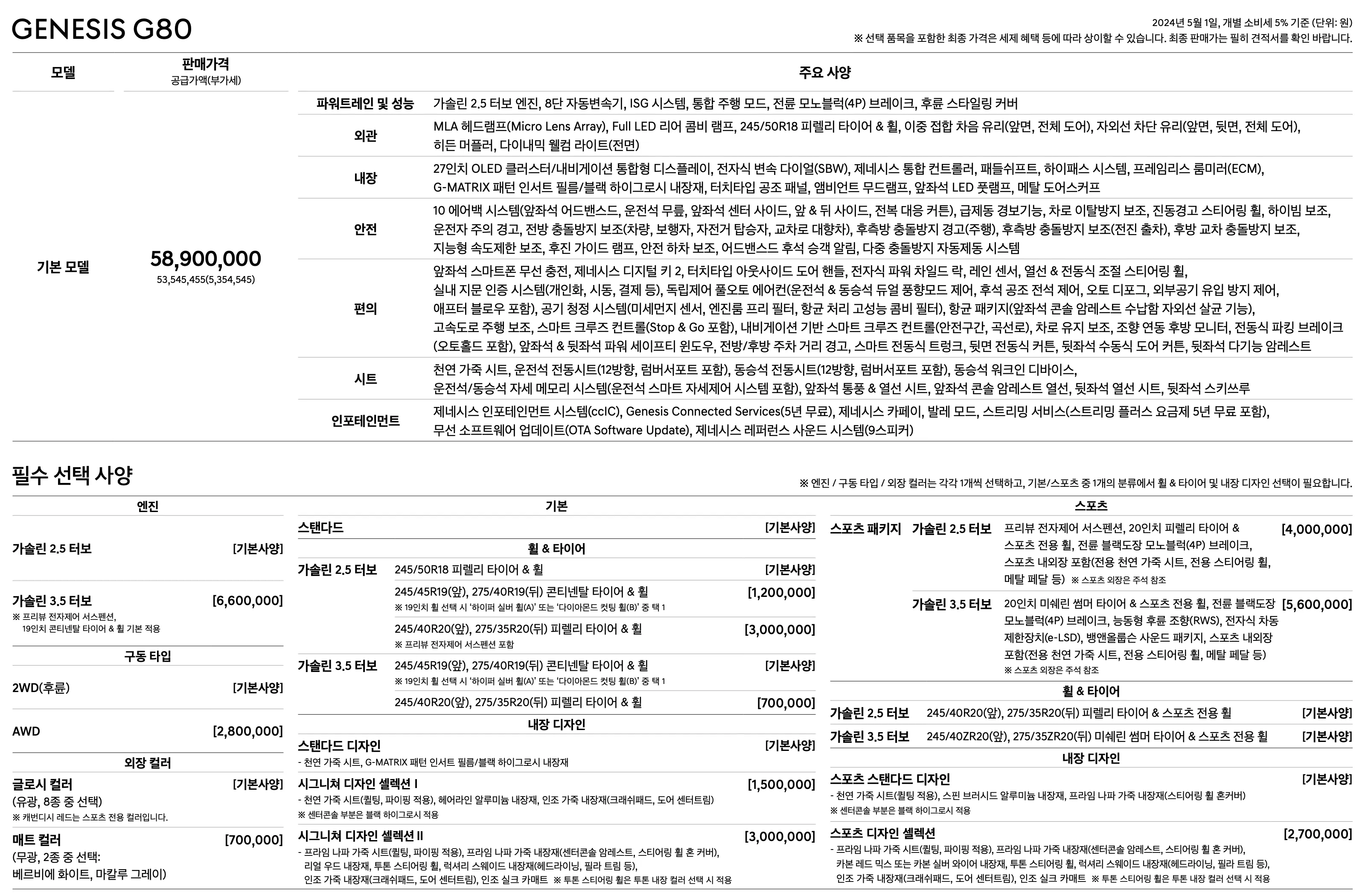 2024 G80의 기본 가격은 5,890만 원입니다. 선택 옵션에 따라 기본 가격에 추가금이 생기기 때문에 아래 가격표를 참고하시기 바랍니다.