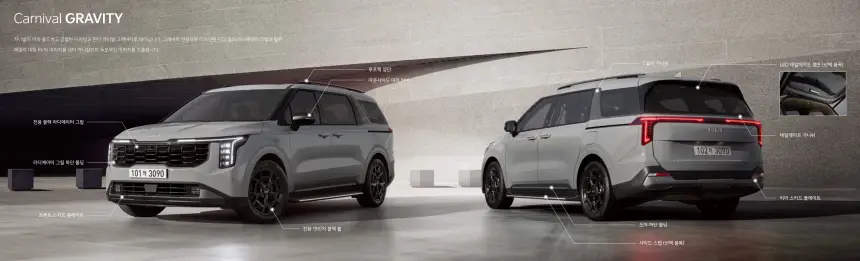 카니발의 디자인은 현대적인 L자형 LED 헤드라이트와 테일라이트 등 현대적 요소를 통합하여 견고한 외관 디자인을 보여줍니다. 실내는 두 가지 톤의 디자인으로 표현되었으며 두 개의 12.3인치 디스플레이가 있는 커브드 디스플레이와 최신 기술과 편의 기능들도 탑제되어 편안한 주행을 보조하고 있습니다.