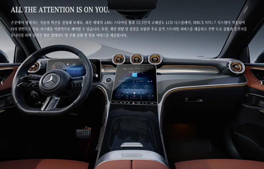GLC클래스는 벤츠 특유의 우아함과 스포티함을 동시에 느낄 수 있는 디자인을 자랑합니다. 전면부는 벤츠의 상징인 삼각별 로고와 커다란 라디에이터 그릴이 시선을 사로잡으며, 날렵한 LED 헤드램프와 강인한 에어 인테이크는 역동적인 느낌을 보여줍니다. 후면은 슬림한 LED 테일램프와 듀얼 머플러가 세련된 분위기를 연출합니다.