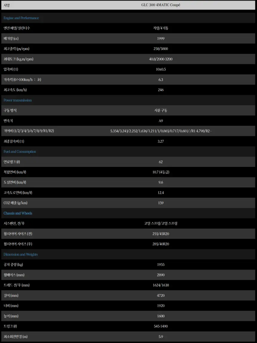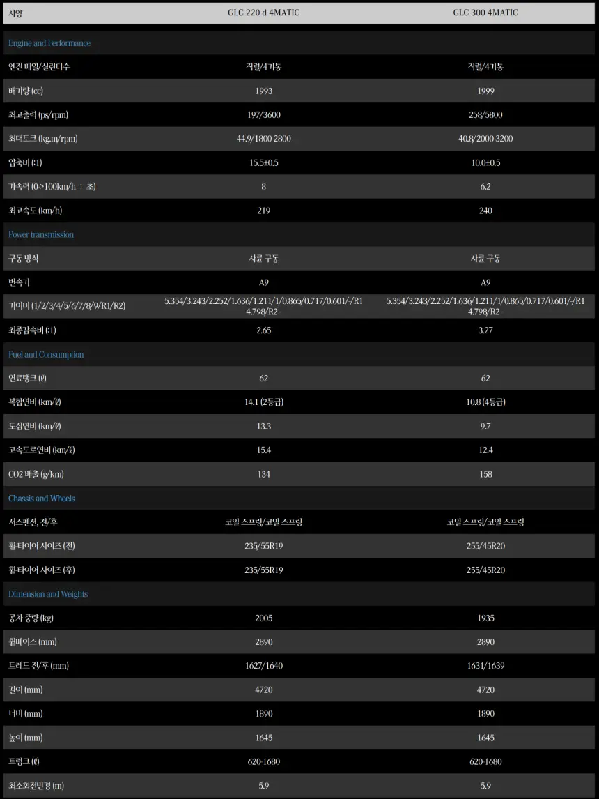 GLC클래스는 2.0L 가솔린 엔진과 48V 마일드 하이브리드 시스템을 결합하여 최고 출력 258마력, 최대 토크 40.8kg.m의 강력한 성능을 발휘합니다. 9단 자동변속기와 조화를 이루어 부드러운 변속감과 빠른 응답성을 제공하고 있습니다.