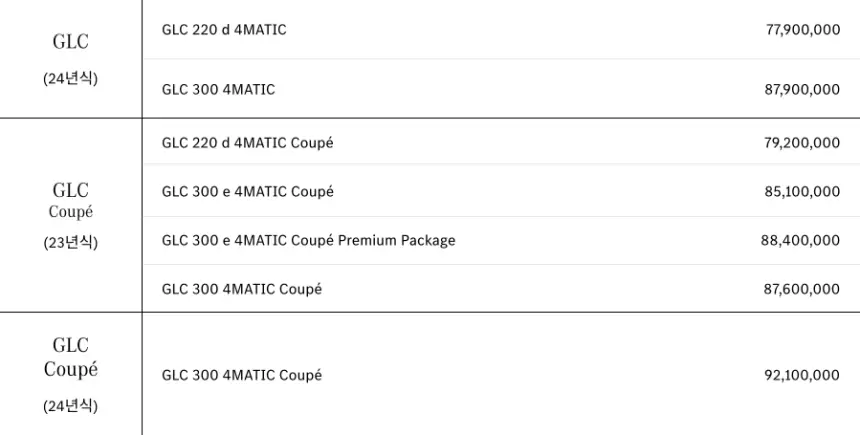 2024 GLC클래스의 기본 가격은 7,790 ~ 9,210만 원입니다. 선택 옵션에 따라 기본 가격에 추가금이 생기기 때문에 아래 가격표를 참고하시기 바랍니다.