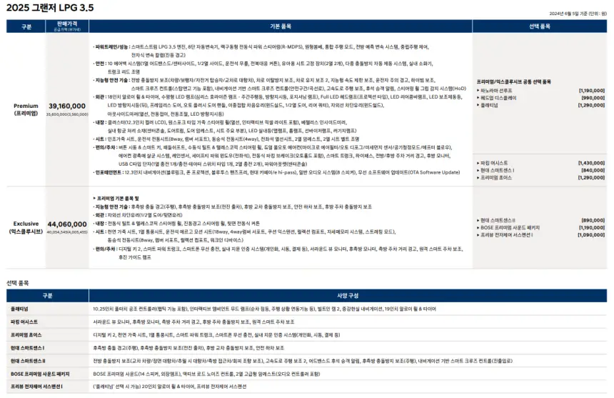 2024 뉴 그랜저 LPG 기본 가격은 3,916 ~ 4,406만 원입니다. 선택 옵션에 따라 기본 가격에 추가금이 생기기 때문에 아래 가격표를 참고하시기 바랍니다.