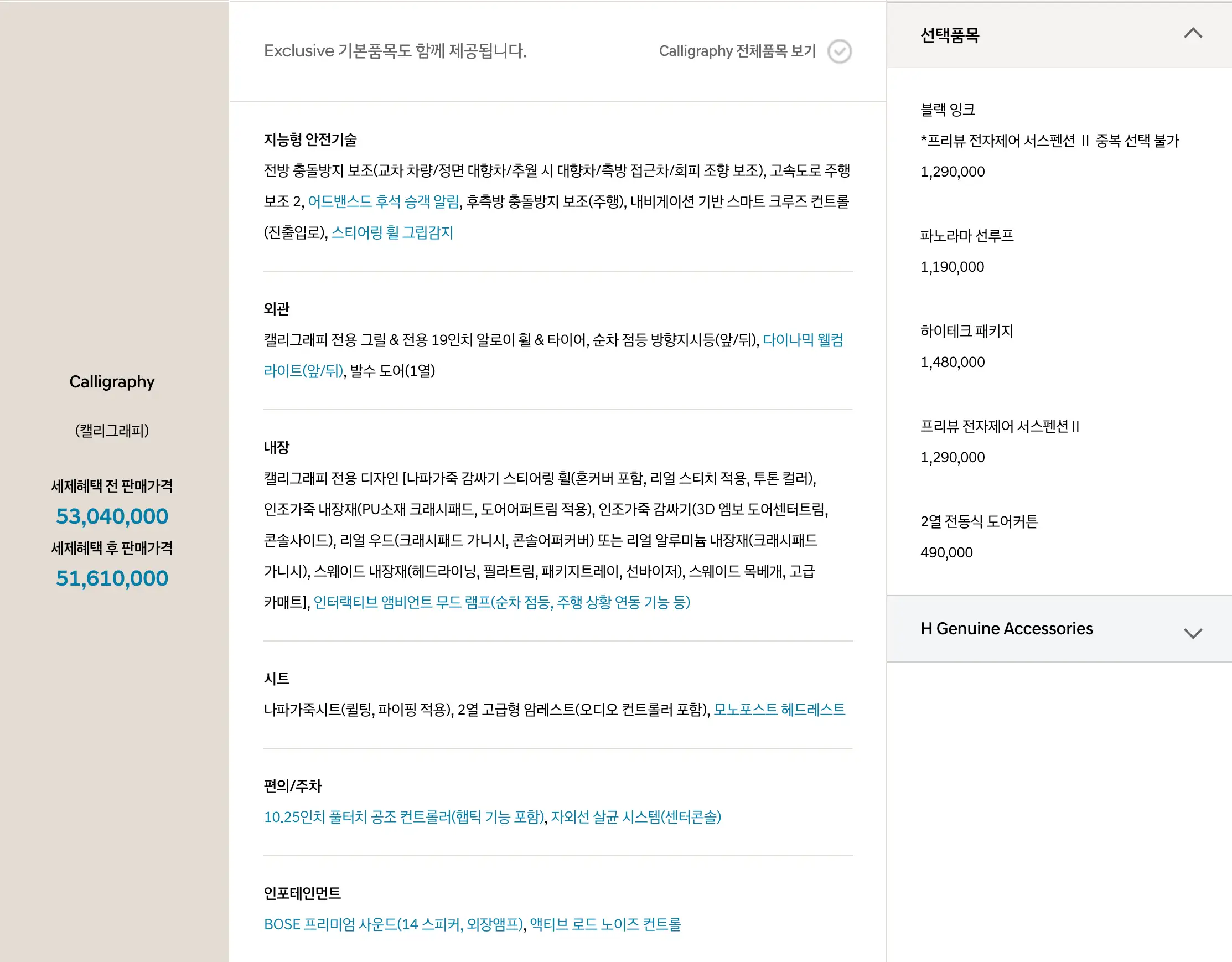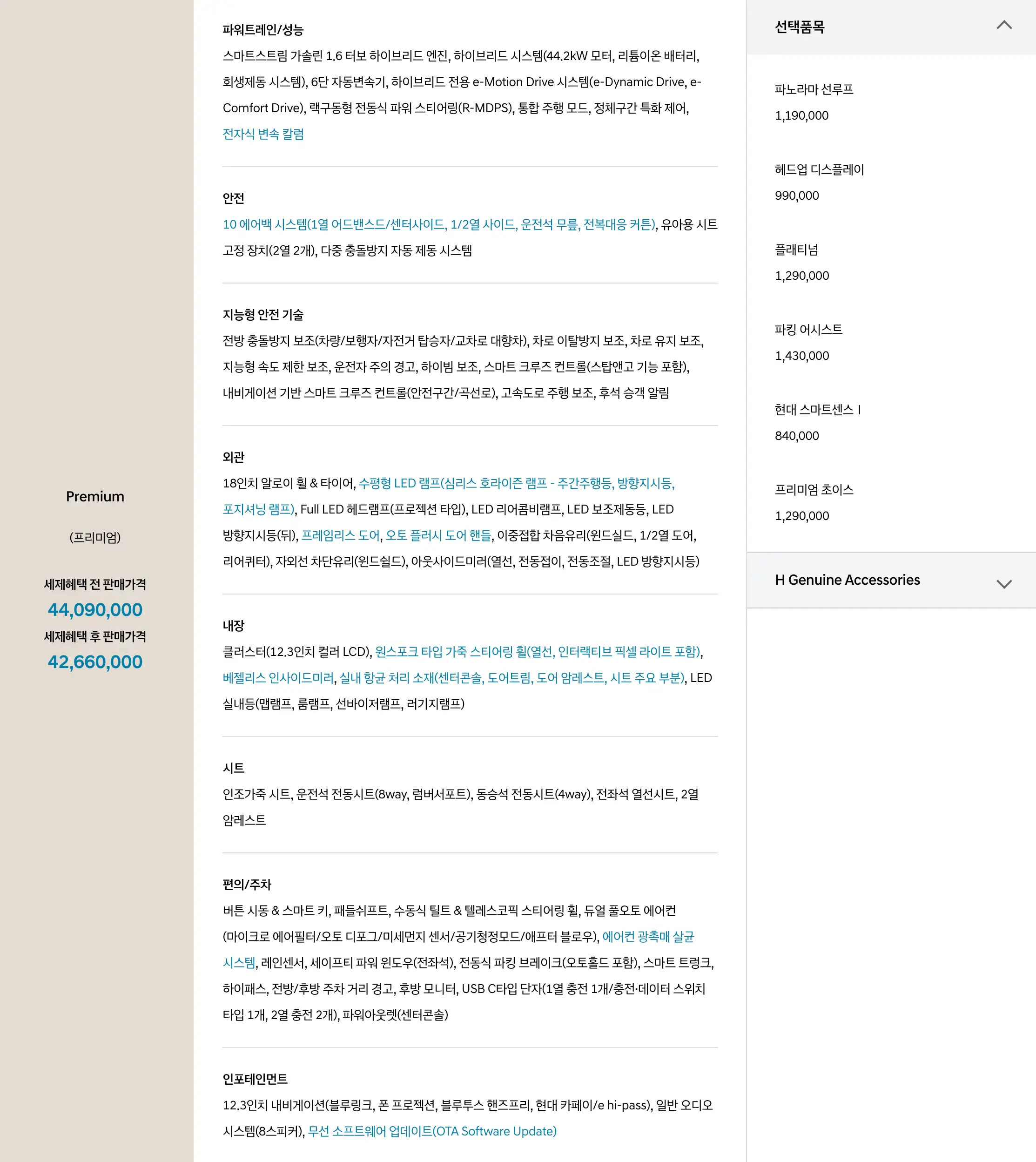 트림별 옵션 선택 품목에 대한 자세한 가격은 아래 가격표를 참고하시기 바랍니다.