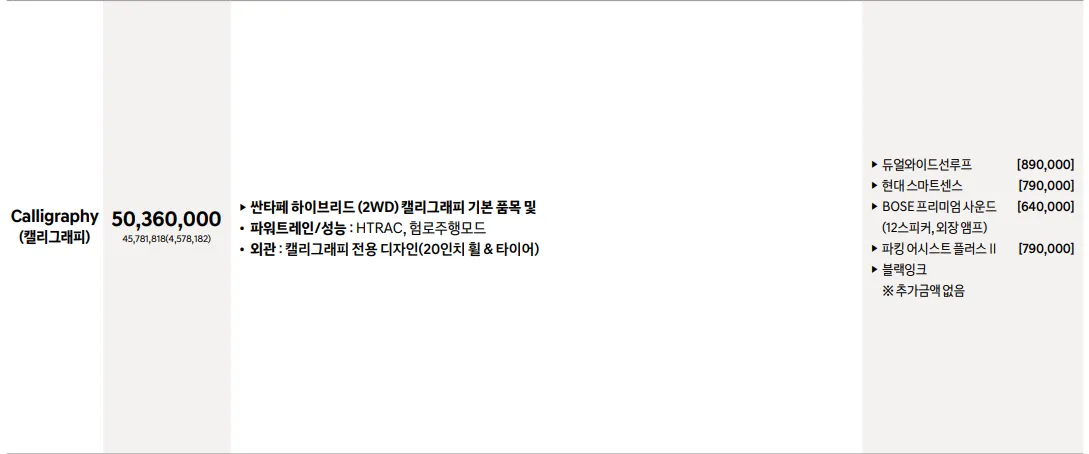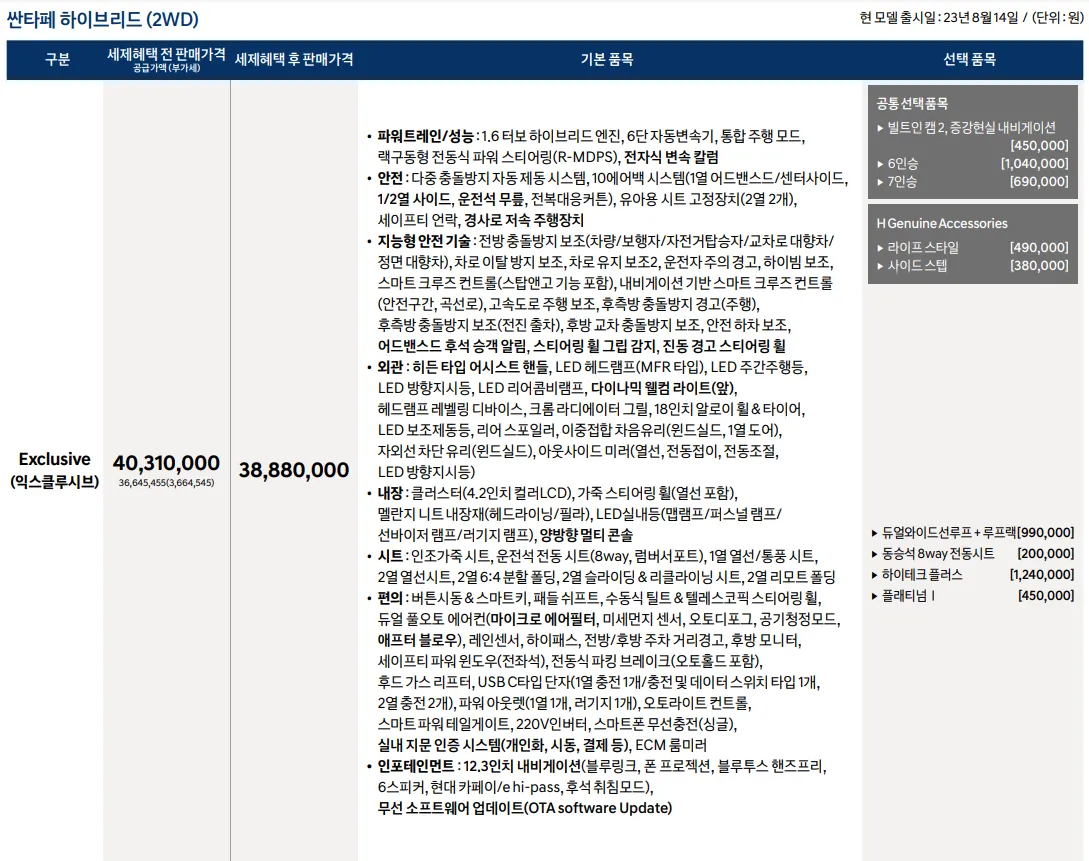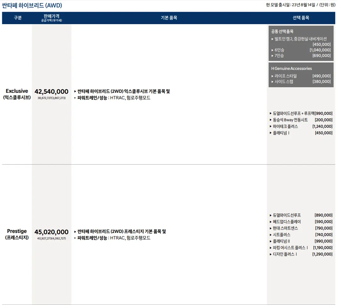 2024 뉴 싼타페 하이브리드 기본 가격은 3,888 ~ 4,621만 원입니다. 선택 옵션에 따라 기본 가격에 추가금이 생기기 때문에 아래 가격표를 참고하시기 바랍니다.