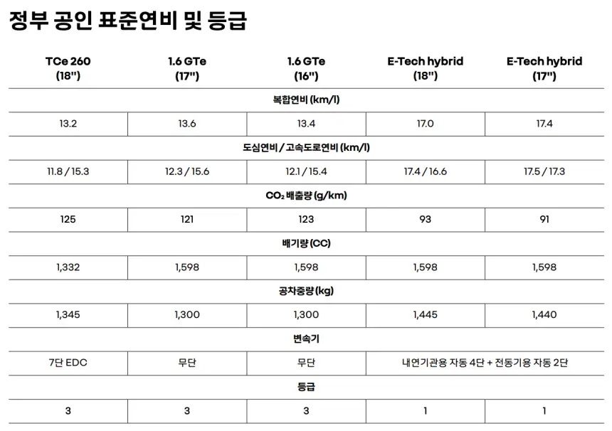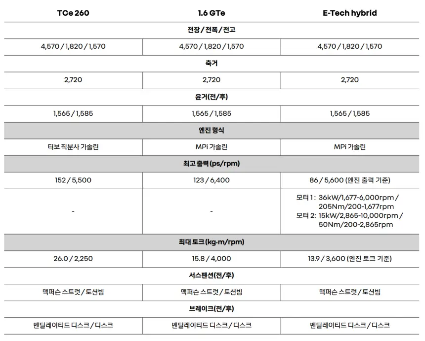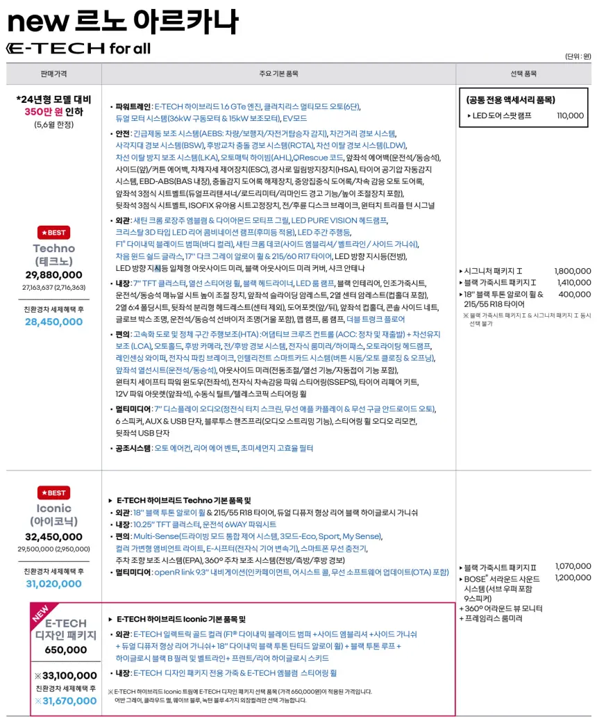 아르카나 하이브리드 차량은 총 3가지 모델로 출시되었는데, 테크노, 아이코닉, E-TECH 디자인 패키지로 구분됩니다. 각각의 트림과 옵션 선택에 따라서 가격이 추가되니 위 가격표를 참고하시기 바랍니다.